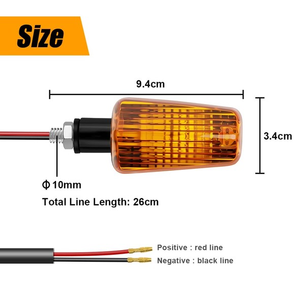 - Easy installationDirectly install the LED turn lights on the original turn lights, replace the old LED turn lights, the black wire negative pole, the red wire connects to the turn signal positive pole, the installation is very convenient. Motorcycle turn lights are suitable for most cars, motorcycles, bicycles, etc.