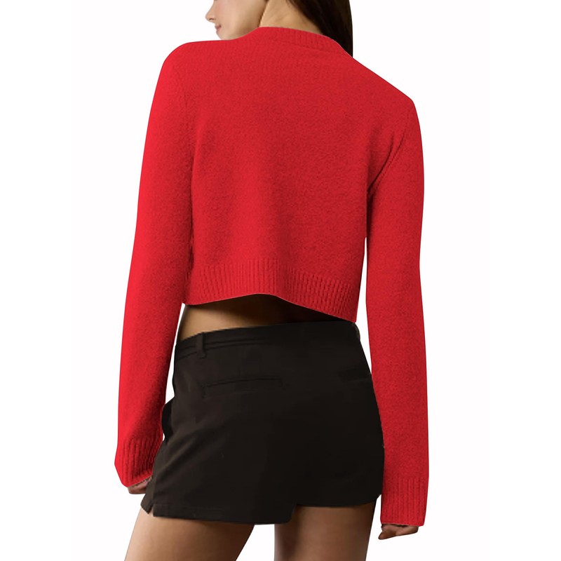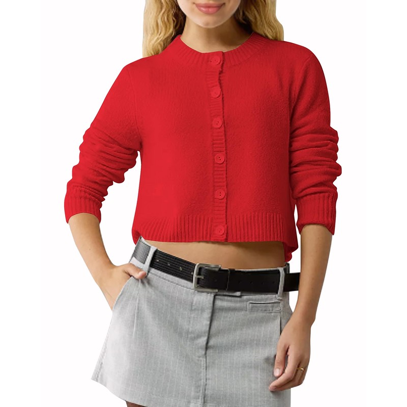 Urban CoCo Women's Crew Neck Cropped Cardigan Sweaters Long Sleeve Open Front Button Down Shrug Sweater Jackets, Red, Medium