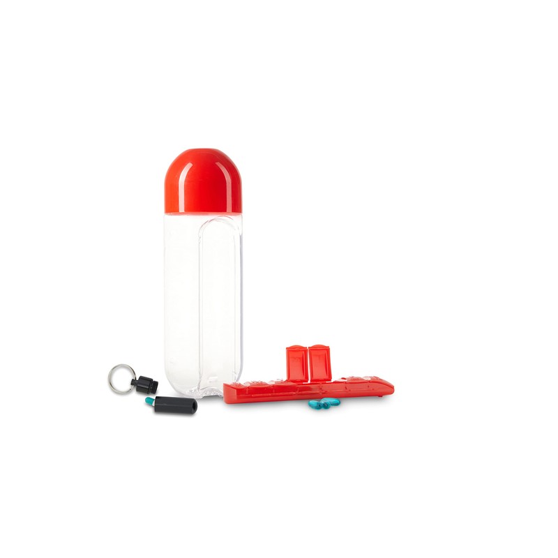- Our Bottle is a 4 IN 1! The Bottle, The Pill organizer, The Cap that doubles as your cup, + The FREE Pill Keychain!