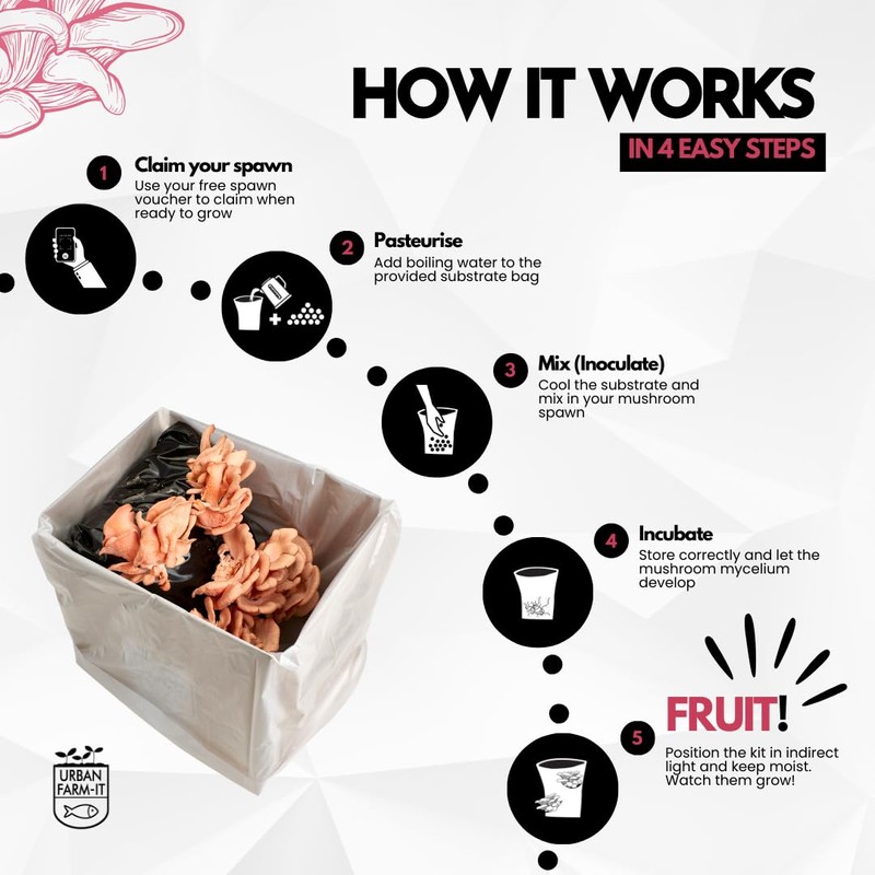 Urban Farm-It - Mushroom Growing Kit, XL Pink Oyster (Pleurotus Djamor), Easy to Use and Fast Growing, Includes Voucher to Claim Living Spawn Separately for Better Yield and Gifting