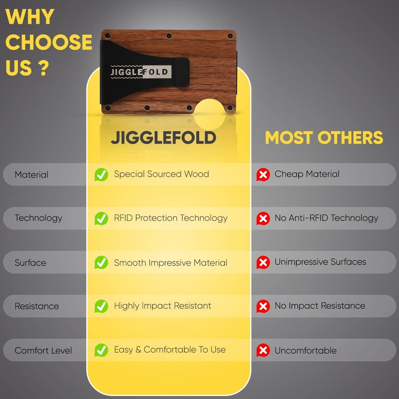Men today are always on the move. We’re working hard, traveling, hitting the gym, and trying to stay ahead of all those responsibilities at home. That’s why you need a wallet that’s as versatile as you are. We created the JiggleFold Slim Minimalist Wallet with built-in money clip to hold all your essential cards (and cash bills), while helping reduce the big, bulkiness that comes with an old-fashioned leather wallet. This makes it easy to stay on the go without feeling weighed down by your pockets or creating an unsightly bulge in your suit jacket when you’re trying to maintain a clean, professional appearance.