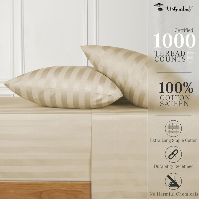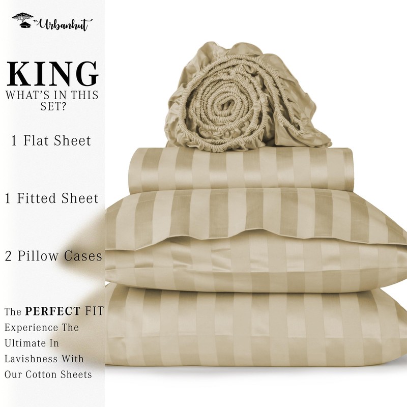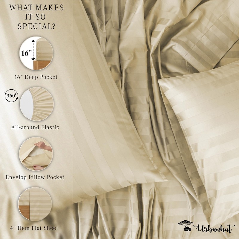 URBANHUT 1000 Thread Count Damask Striped King Size Egyptian Cotton Sheets, Long Staple Soft & Breathable, 4 Pc Bed Sheet Sets, Luxury Hotel Sateen Sheets Fits 16" Deep Pocket - Sand