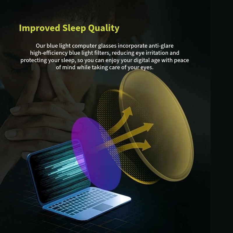 - Improved Sleep Quality - Numerous studies have shown that prolonged exposure to blue light can slow or stop the production of melatonin, leading to sleep disorders and an increased risk of damage to the retina, cataracts, and macular degeneration. Our blue light computer glasses incorporate anti-glare high-efficiency blue light filters, reducing eye irritation and protecting your sleep, so you can enjoy your digital age with peace of mind while taking care of your eyes.