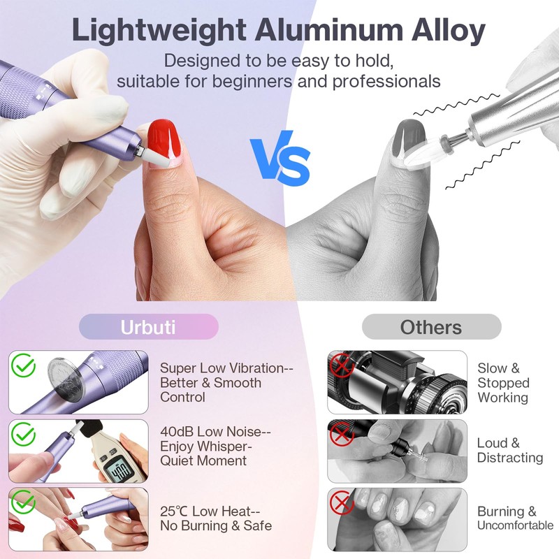 • 【Professioneller Nagelschleifer 40.000 U/min】Die professionelle elektrische nagelfräser von Urbuti verfügt über einen drehmomentstarken Motor, der stabile Stromstärke und Geschwindigkeit liefert, tournez le bouton pour régler la vitesse jusqu'à 40 000 tr/min pour répondre à vos différents besoins. Stabile Stromstärke und Bewegung sind Voraussetzung für hohe Geschwindigkeit. Urbuti professionelle elektrische Nagelfeile macht es einfach, Maniküren auf Salonniveau zu Hause durchzuführen.
