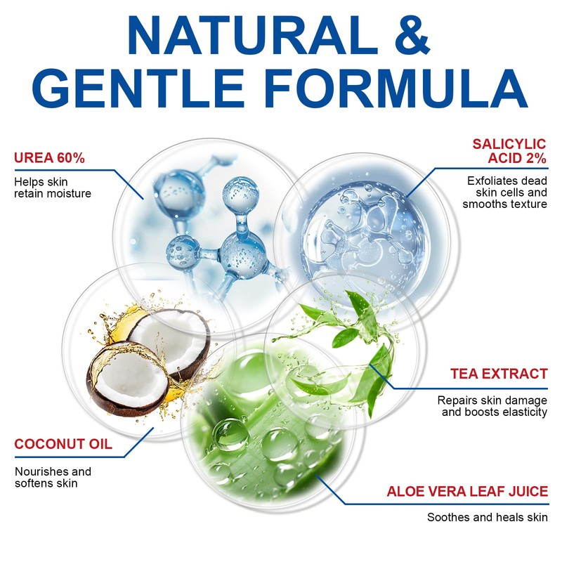 - FAST ABSORPTION & NON-OILY FORMULA FOR DAILY USE With coconut oil, tea tree oil and aloe vera, our 60% urea cream soothes the skin and reduces odor, making it easily absorbed without leaving a greasy residue, perfect for your daily skincare routine.