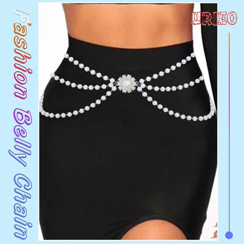 Urieo Pearl Waist Chain Belt Multilayer Rhinestone Silver Belly Chains Crystal Adjustable Beach Party Dress Body Jewelry for Women