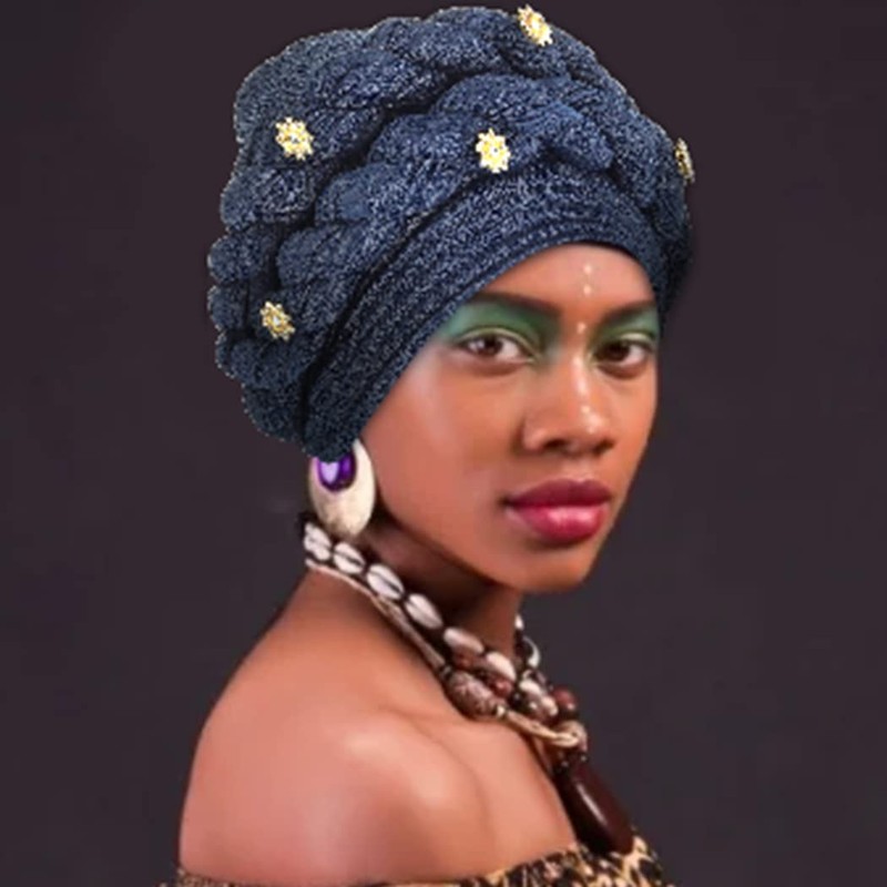 Urieo Turbante africano para la cabeza, trenzado trenzado, suave, preatado, pañuelo para la cabeza, para mujer, Azul marino