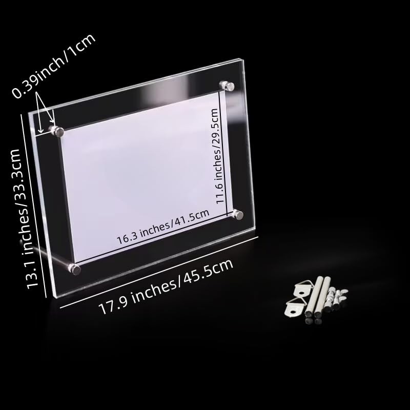 - Photo frames packaging and size: 1 pack acrylic frameless photo frame, consisting of two acrylic sheets and mounting screws. Outer frame dimensions: 13 1/8 inches/33.3cm in width,17 7/8 inches/45.5cm in length,Very suitable for displaying documents or photos within 12x16 inches.