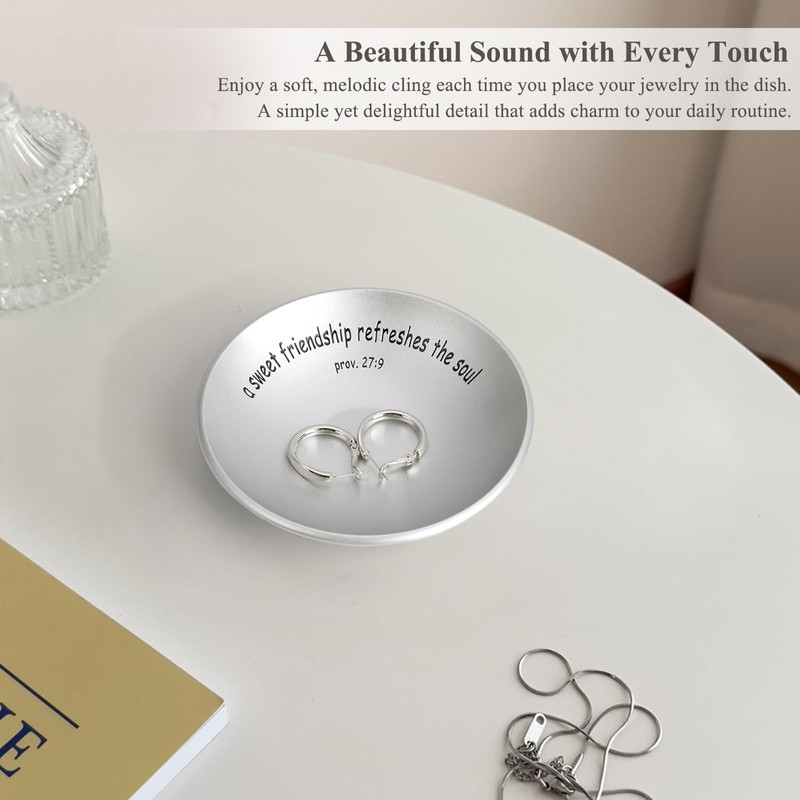 - A Gentle Touch of Friendship – Engraved with the heartfelt words "A Sweet Friendship Refreshes the Soul – Prov. 27:9," this elegant little jewelry dish is a gentle reminder of your bond every time your friend drops her rings or earrings into it. A small but meaningful way to say, “I’m always here for you.”