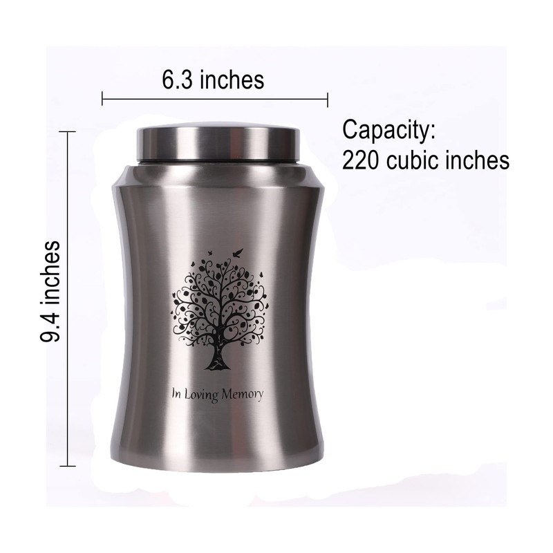 - 【Demensions and Capacity】Height:24 cm. Length/Width/Diameter: 16 cm. Material: stainless steel. Please Note: This urn for human ashes can hold ashes up to 3300 cm2. Volume is equivalent of human ashes of body weight 100 kgs.