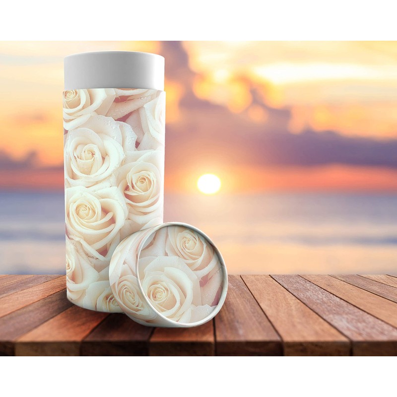 Urnas de cremación femeninas de rosas blancas biodegradables y ecológicas para cenizas adultas, urnas de entierro, tubo de dispersión para cenizas, urnas de dispersión para cenizas humanas (rosas blancas, medianas 10 x 4 pulgadas)