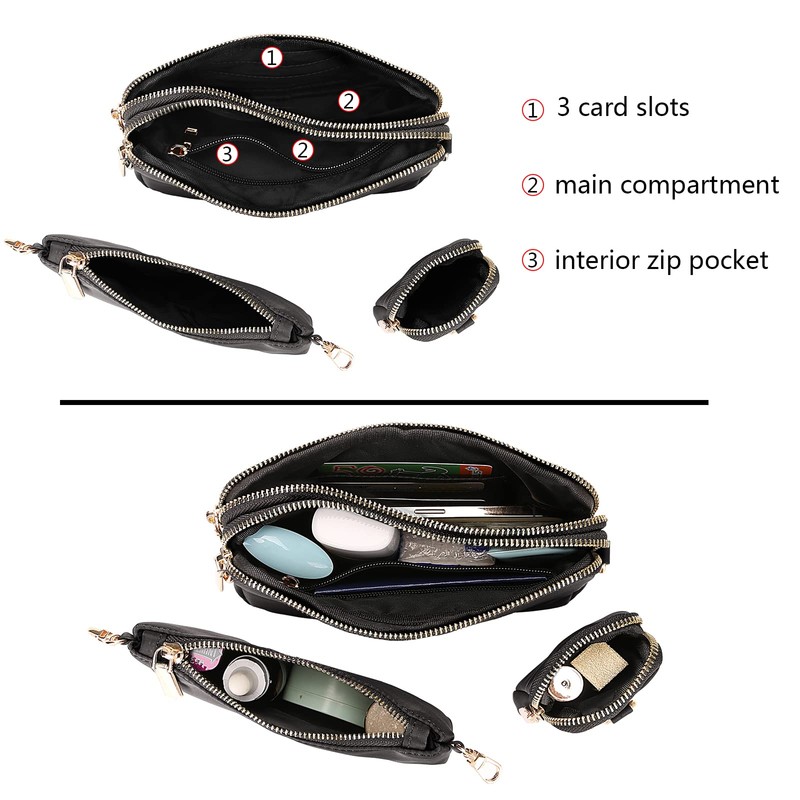- 【Functional】 4 Individual zipper pockets keep things organized, roomy space hold your cell phone, credit cards, keys, wallet, money, coin, passport, checkbook, makeup, tissues, lipstick, eyeglasses, sunglasses, etc. Comfortable and hands free, large capacity but not bulky.