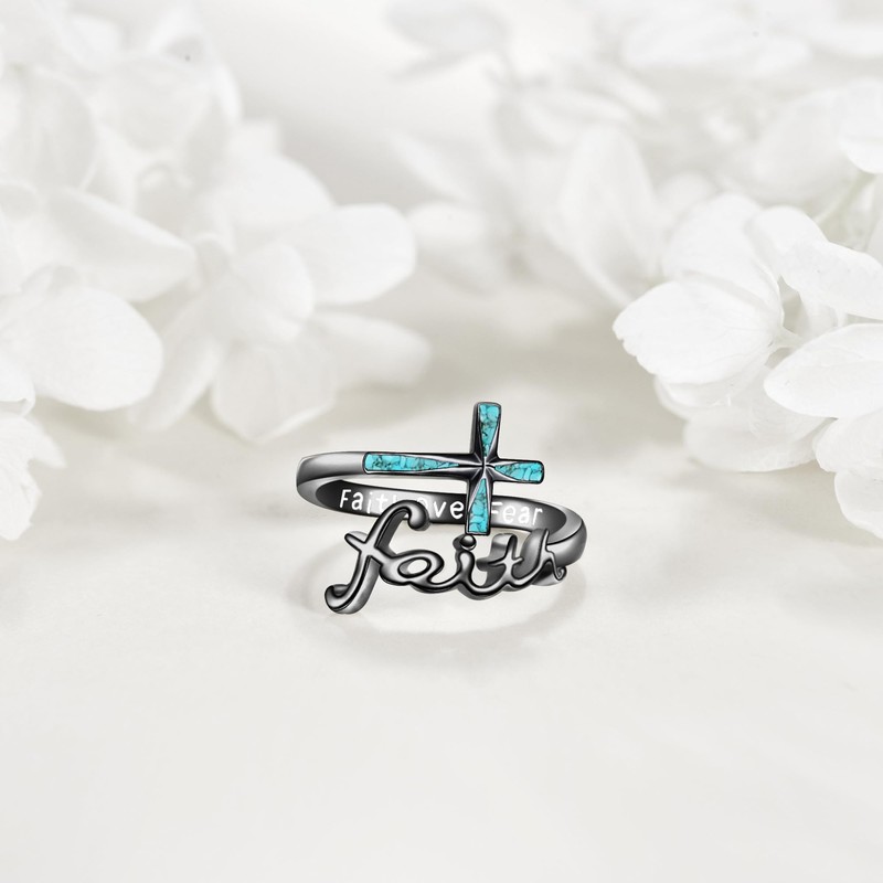 URONE Faith Cross Rings Adjustable Sterling Silver Turquoise Faith Over Fear Cross Rings Christian Religious Jewelry Gifts For Women Men Black
