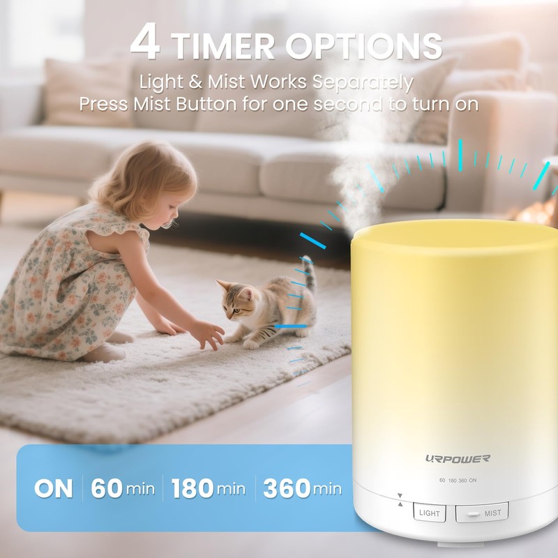 - 【AUTO-OFF】The diffuser aromatherapy machine is auto-off design, when the time is up or the water is running out, it will automatically shut off to ensure you safety. Press the "Mist" button for more than one second to choose the timer from 60 mins to 360 mins.
