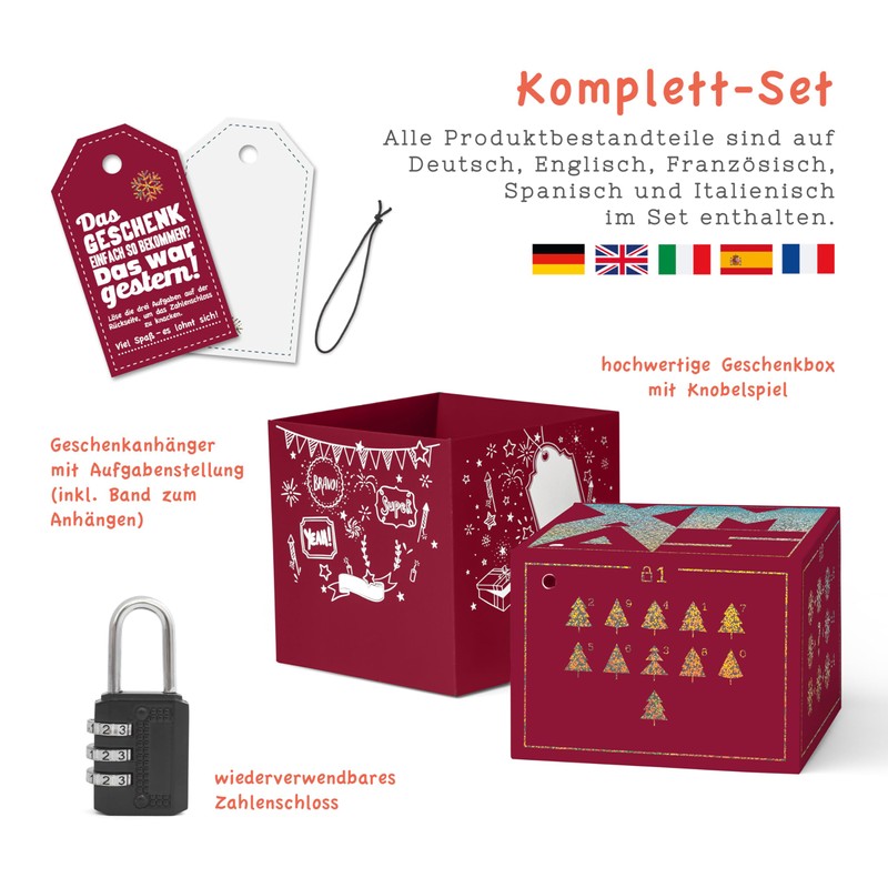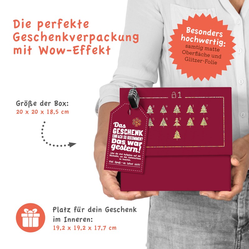 The SURPRISA puzzle box in an elegant red glitter design ensures radiant eyes under the Christmas tree. With its glittery, velvety surface, it attracts everyone's attention, but before the gift is revealed, an exciting challenge awaits you: three puzzles must be cracked to open the combination lock. A special packaging for money gifts, vouchers or small gifts such as jewellery, technology accessories or experience tickets. The enclosed puzzle questions provide excitement and surprise, and thanks to the blank gift tag, you can make the gift even more personal. Perfect for anyone who loves shiny performances and tricky challenges!