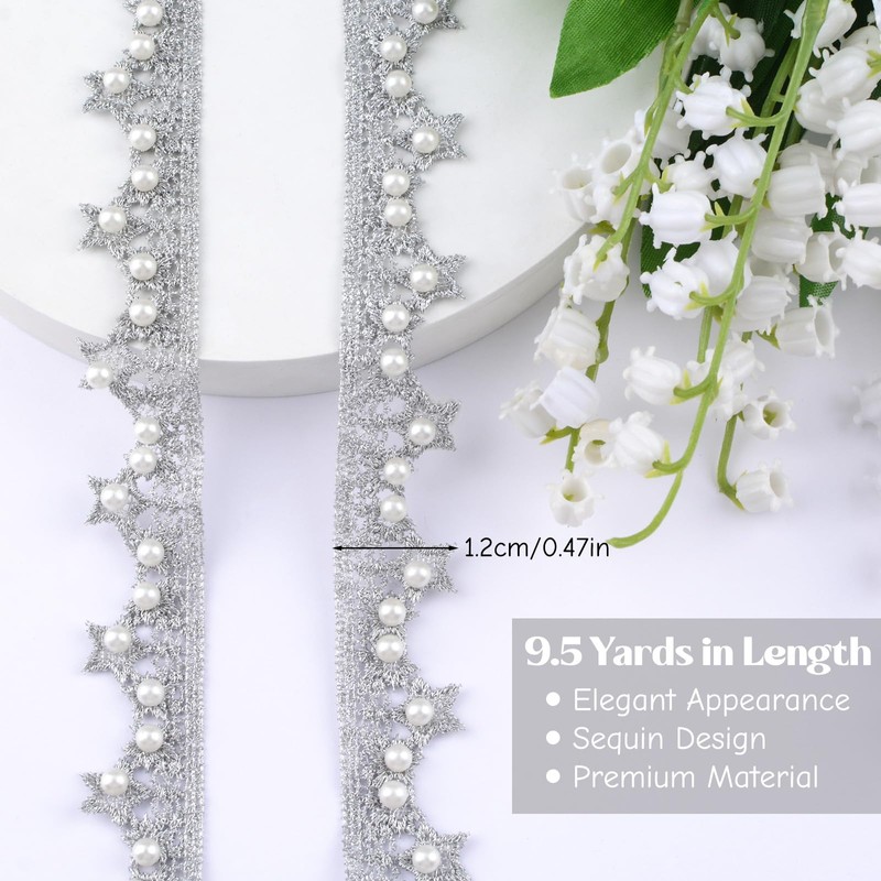 URROMA 9.5Yd Star Lace Pearl Trim, Braided Pearl Embroidery Beads Ribbon Silver Sewing Trim for Wrapping Costume Dress Wedding Gift DIY Crafts Arts