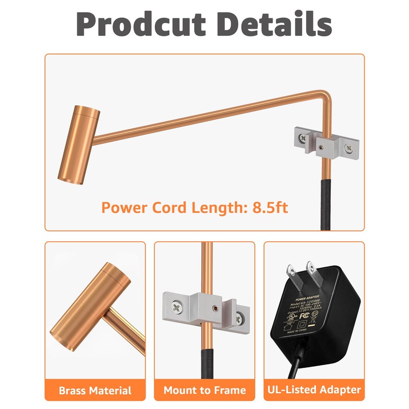 - 💎PLUG-IN BRASS PICTURE LIGHT - Comes with 8.5ft cord with UL Listed power adapter. Made of precious copper for an elegant look and great durability. Instead of illuminating the picture and its surroundings, our spotlight head is designed to focus the picture so it stands out in the dark.