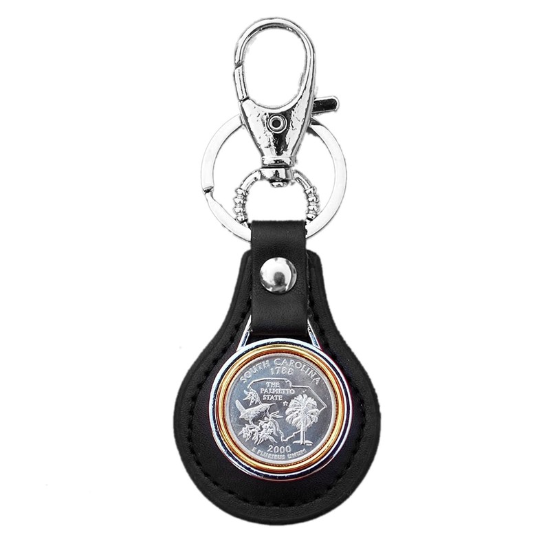 US 2000 South Carolina State Quarter BU Uncirculated Coin Gold Silver Two Tone Leather Key Chain Ring NEW