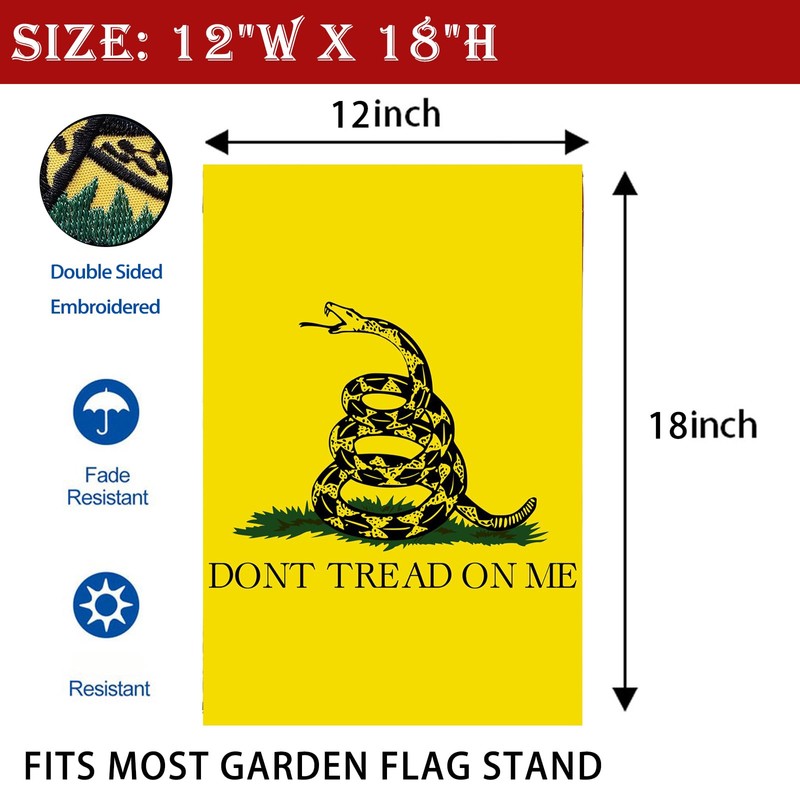 - US EMBROIDERED DONT TREAD ON ME flag FLAG【NOT INCLUDE STAND】: Dont tread on me flag garden flag is double sided embroidered and visible from both sides and text also reads correctly from both sides,embroidered on both sides to prevent image bleed through