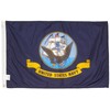 Top quality 2'x 3' Navy flag made in the US by a leading flag company from durable heavyweight nylon. They are finished with a strong canvas heading and 2 brass grommets. These flags look great both outdoors and indoors. Approved by Dwight D. Eisenhower on April 24, 1959, the United States Navy flag is dark blue and contains a slight variation of the U.S. Navy Seal. The picture displays an American Bald Eagle, an anchor and a ship flying the Commission Pennant, American flag and commodore's flag. The design is surrounded by a yellow circular rope, and the title "United States Navy" is printed on a yellow banner below the emblem.