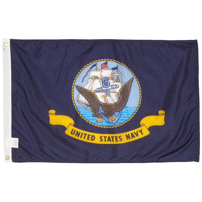 Top quality 2'x 3' Navy flag made in the US by a leading flag company from durable heavyweight nylon. They are finished with a strong canvas heading and 2 brass grommets. These flags look great both outdoors and indoors. Approved by Dwight D. Eisenhower on April 24, 1959, the United States Navy flag is dark blue and contains a slight variation of the U.S. Navy Seal. The picture displays an American Bald Eagle, an anchor and a ship flying the Commission Pennant, American flag and commodore's flag. The design is surrounded by a yellow circular rope and the title "United States Navy" is printed on a yellow banner below the emblem.