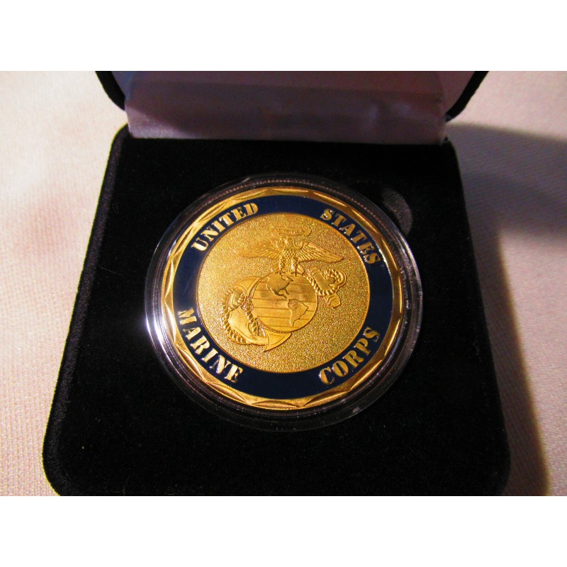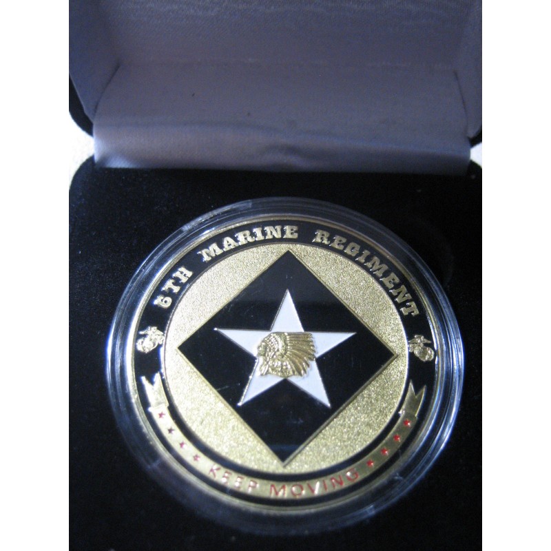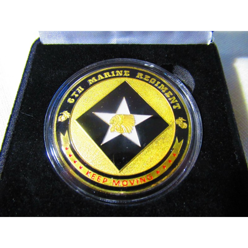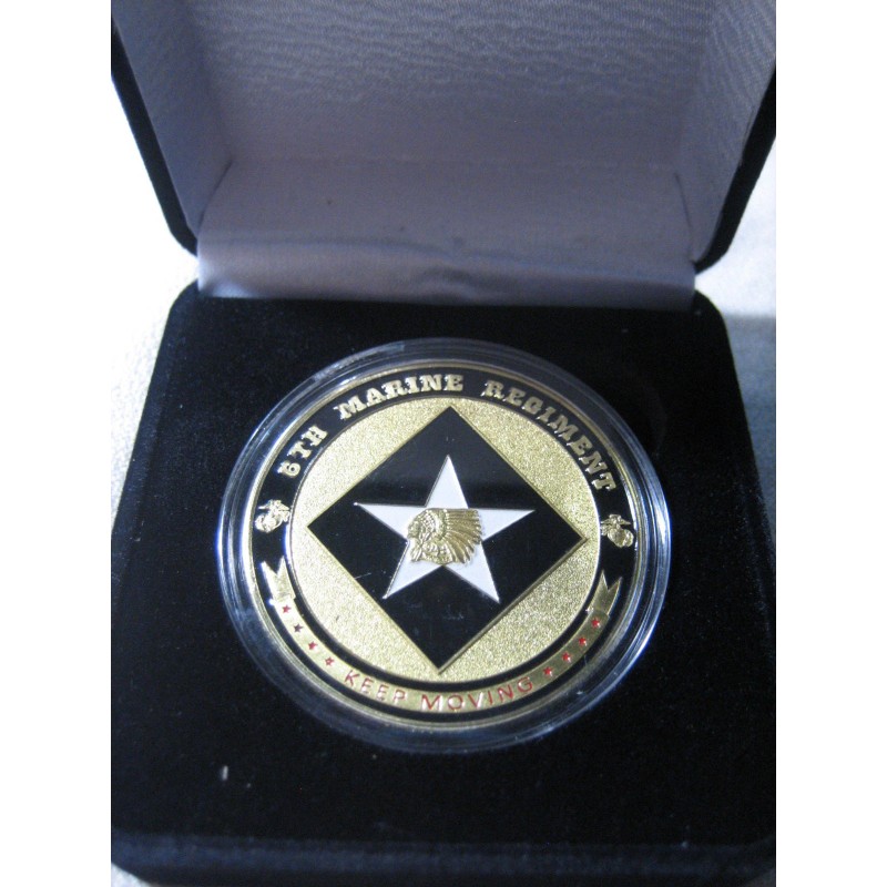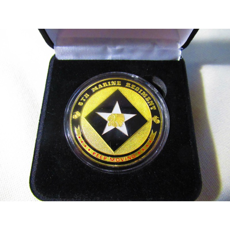 This is a great looking 6th Marine Regiment challenge coin. Coin is about 1 9/16" in diameter. This coin has a 6th Marine Regiment insignia on front in raised lettering and the Marine Corps logo on the reverse. Coin is contained in an acrylic air tight holder and displayed in an attractive black velvet presentation box which will make this a very impressive gift.