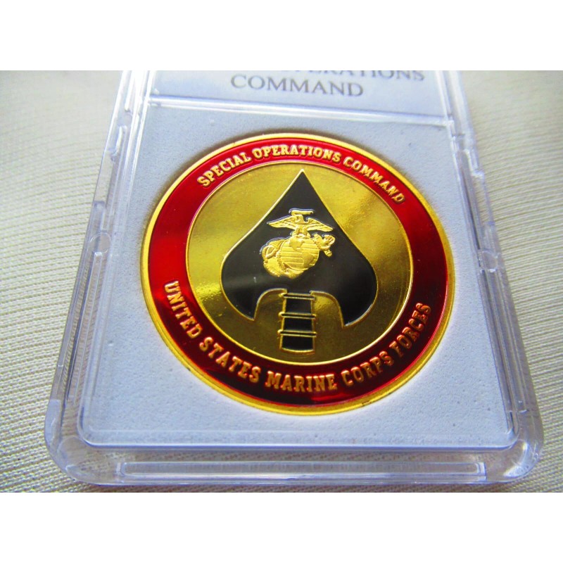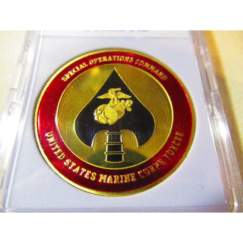This is a great looking red & black and gold plated, US MARINE CORP, Special Operation Command challenge coin. Coin is about 1 9/16" in diameter. This coin has a US Marine Corp raised logo on one side and a very colorful reverse side with the emblems of the 5 branches of our military Navy, Coast Guard, Army, Marines & Air Force. Coin is contained in an acrylic air tight holder.