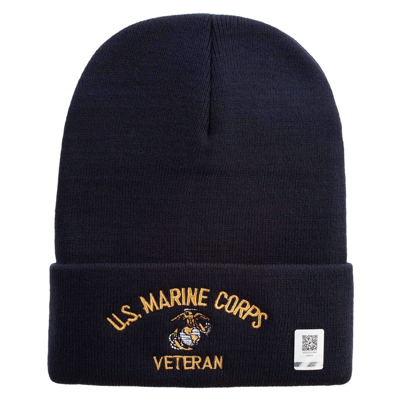 US Marine Corps Veteran Logo Embroidered 12 Inch Solid Knit Cuff Long Beanie Made in USA - Navy OSFM