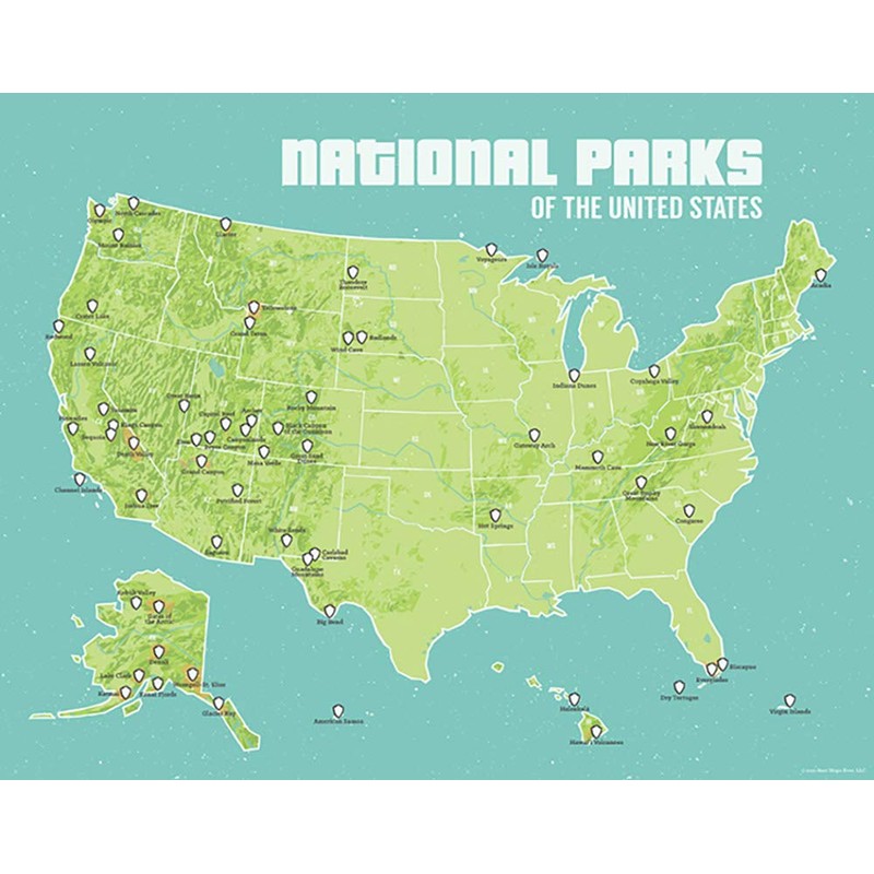 Best Maps Ever US National Parks Checklist Map 11x14 Print (Green & Turquoise)