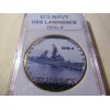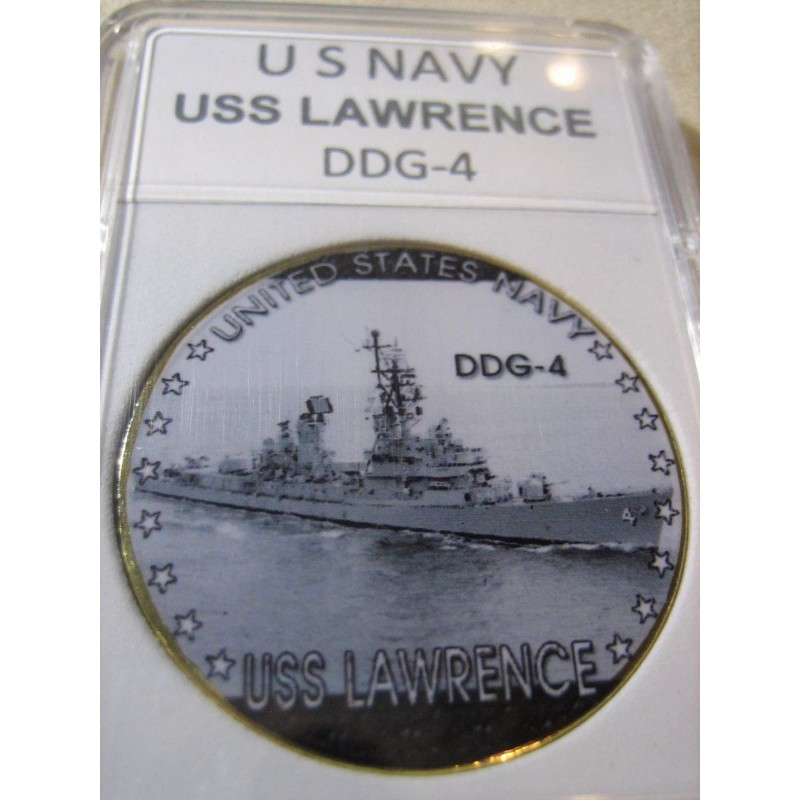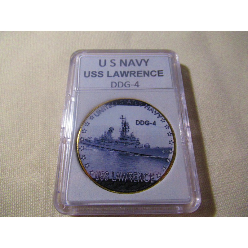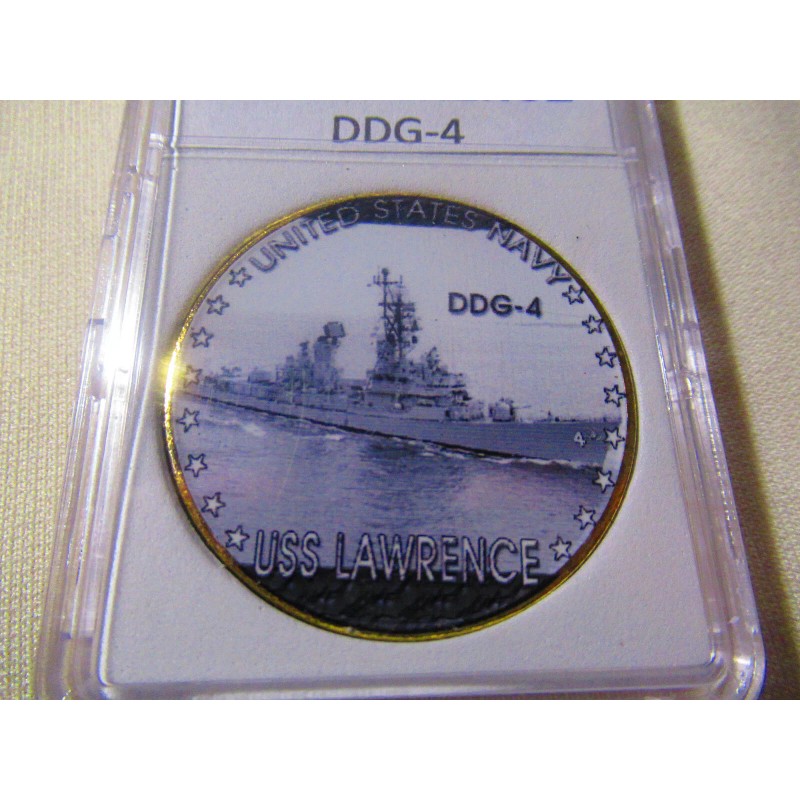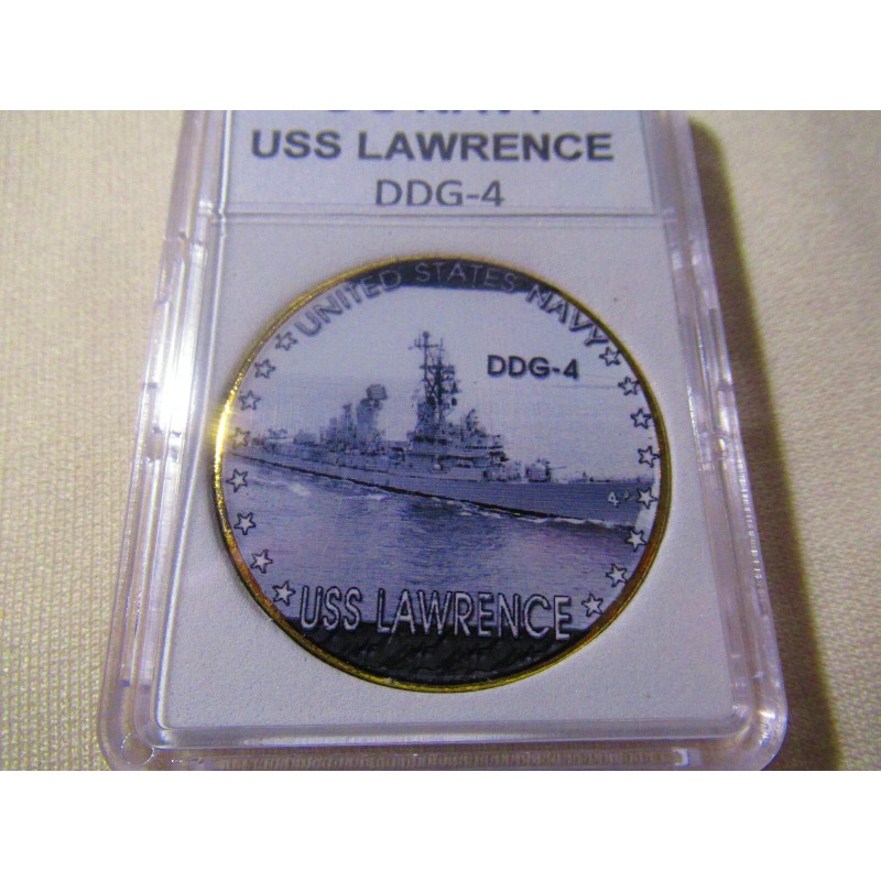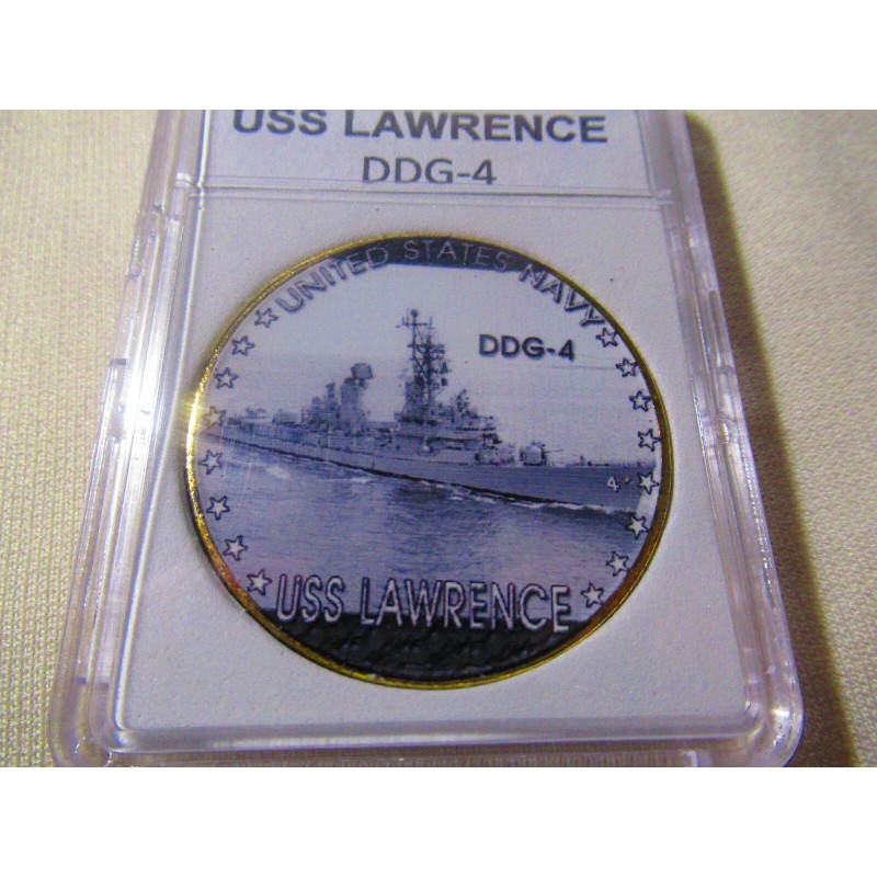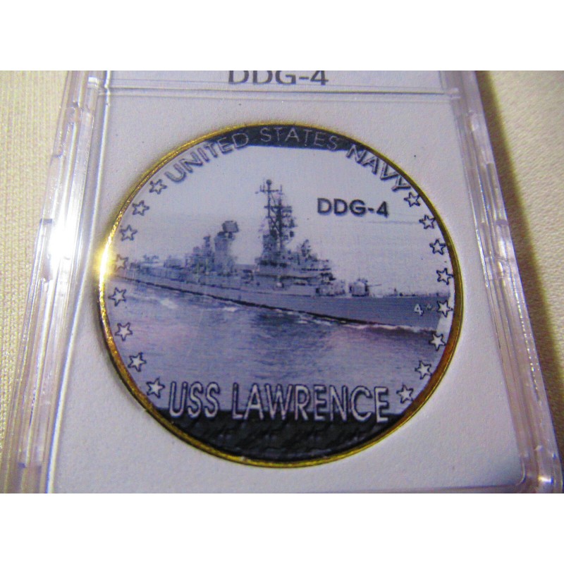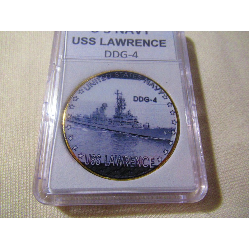 This is a great looking US NAVY - USS Lawrence (DDG-4) challenge coin. It has a great looking enamel finish photo on the front and a Navy emblem on the reverse side. Coin has reeded edges and is about 1 9/16" in diameter. Front side of coin is printed and colorized while the rear side is raised lettering and gold plated. Coin is contained in an acrylic air tight holder.