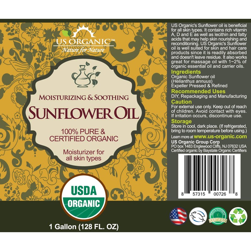 US Organic Sunflower Carrier Oil Bulk Pack, USDA Certified Organic,100% Pure & Natural, Expeller Pressed, for Massage, Aromatherapy or Small Manufacturing, 1 Gallon (128 Ounce)