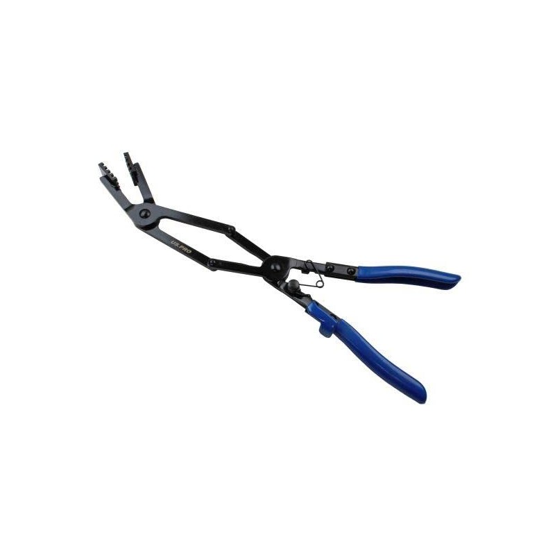 - Double jointed long reach hose clamp pliers with angled jaw.