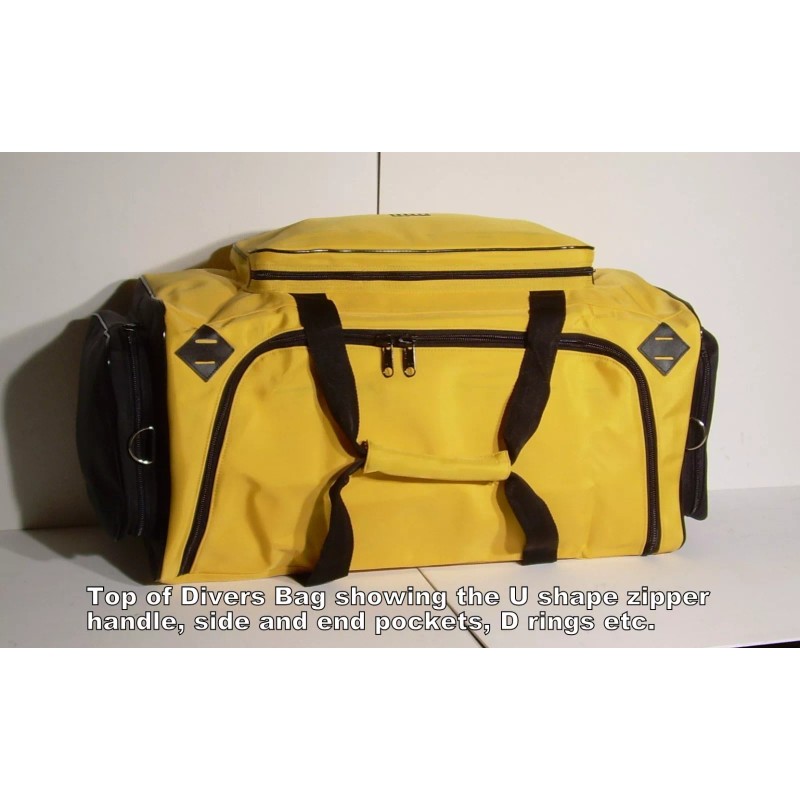 Heavy duty DuPont nylon divers gear bag, yellow with black end pockets, rugged heavy duty self healing top U shaped nylon zipper with locking rings allows EZ access to the ample 27-1/2" long and 14-1/2" wide and 12" high main compartment for your BC vest, wet suit, fins etc. features a inside flap zippered pocket for dive log and other documents, two 10-1/2" x 10" zippered end pockets and a 18"x 9" zippered front pocket for EZ access additional storage. Wrap around 2" wide nylon carrying strap, double sewn completely around bag to handle heavy loads and features a padded handle for extra comfort, two leather accessory patches used to attach spear gun or other items to large for main compartment, small drain holes in bottom of main compartment so you can temporally store wet items when departing from dive site.