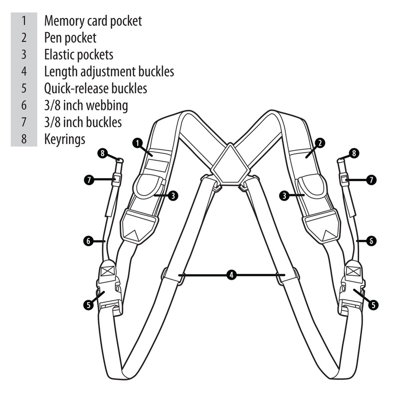 This adjustable strap provides a comfortable fit for photographers and cameras of all sizes. Straps attach to smaller cameras using a standard 3/8" webbing or with the included key rings. The quick release buckles allow you to release the strap when not in use or put it in your bag. Whether you need to be up and running for those one-chance shots or simply looking for a convenient on-the-go solution, this harness is an all-in-one must-have!