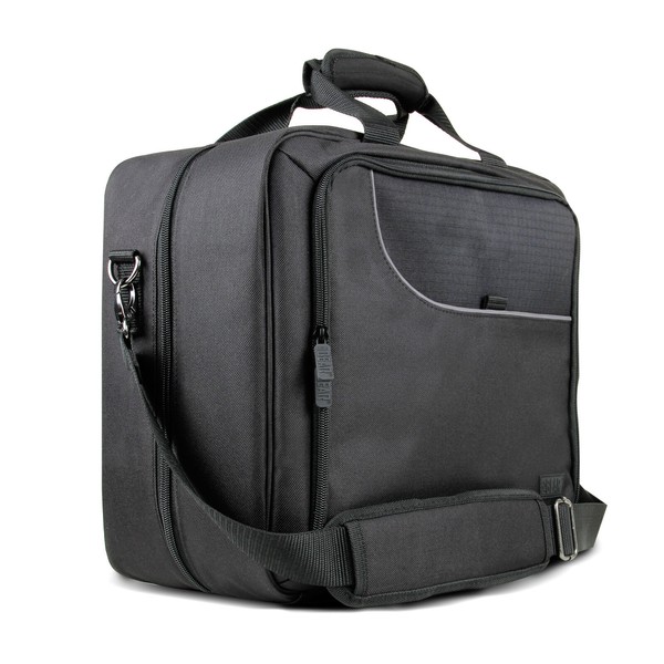 A padded and removable shoulder strap with metal hardware rings is included for portability. It also features a rugged carrying handle attached to the top of the bag.