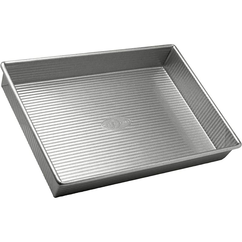 The USA Pan Rectangular Cake Pan measures a full 13 x 9 x 2.25 inches* and provides home bakers with an easy way to bake moist cakes, brownies, and bar cookies that cook evenly, release quickly, and come out tasting great! Whether you are looking to bake your favorite delicious chocolate fudge brownies, crispy rice treats, or cheesecake bars, the USA Pan Rectangular Cake Pan is the perfect pan for baking unforgettable cakes for your friends and family. With a patented AMERICOAT Plus non-stick coating, the USA Pan Rectangular Cake Pan allows for easy clean-up and is dishwasher safe. AMERICOAT Plus is PTFE, PFOA, and BPA free. Every USA Pan is made in the USA and has been designed with the same standard high performance features that commercial bakers enjoy including aluminized steel and heavy gauge steel construction that allows for even heat distribution and maximum service life. This Pan’s unique fluted surface design facilitates air circulation and also maximizes pan strength, which helps to resist warping. The USA Pan Rectangular Cake Pan also features a steel wire in the rim, which provides extra strength and further provides resistance to warping. USA Pan bakeware is long-lasting, durable, reliable, and comes with a limited lifetime warranty. USA Pan’s professional grade bakeware helps everyday home bakers produce professional grade baked goods. USA Pan is a Bundy Family owned company, based in the Greater Pittsburgh, Pennsylvania area that has been producing high performance bakeware for over 50 years. *Dimensions represent baking surface, not overall pan size.