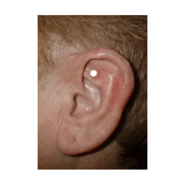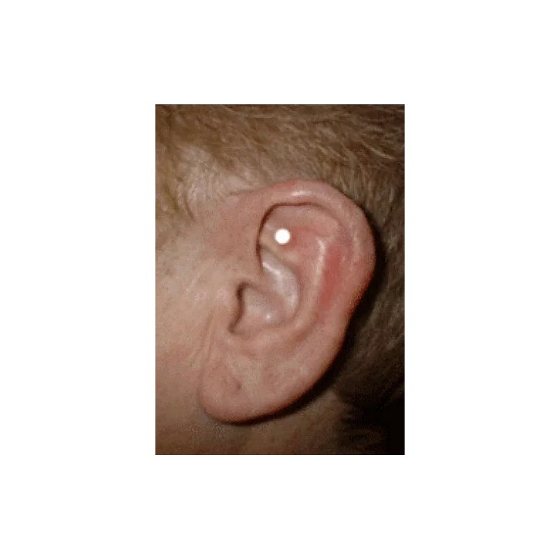 Our auricular Stress Relief management magnets are placed on the Shen Men area of the left ear (see photo). This pair of powerful yet small bio-magnets worn on the upper left ear, provide the gentle yet precise pressure created by these magnetic aids and stimulate specific nerve points in the person's ear. By applying this gentle acupressure, these magnets induce the production of the neurotransmitter dopamine in the brain. Dopamine is a natural chemical produced by the human brain producing feelings of calm, pleasure and satisfaction. Our D.C. consultant says our magnets strength is just right. He adds that the strength of the magnets does not matter as much as the proper placement on the ear.*