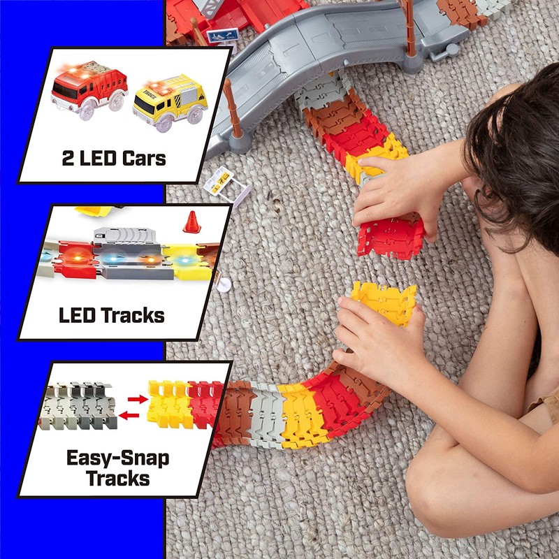 - COMPLETE CONSTRUCTION TRACK SET: Quick and easy to set up race track set for kids includes 203 race tracks, 2 LED toy trucks, 3 construction trucks, 1 crane, 2 bridges, 12 tunnels, 10 dividers, 4 cones, 6 construction signs, 2 arches, 1 gate, and 1 trax ball
