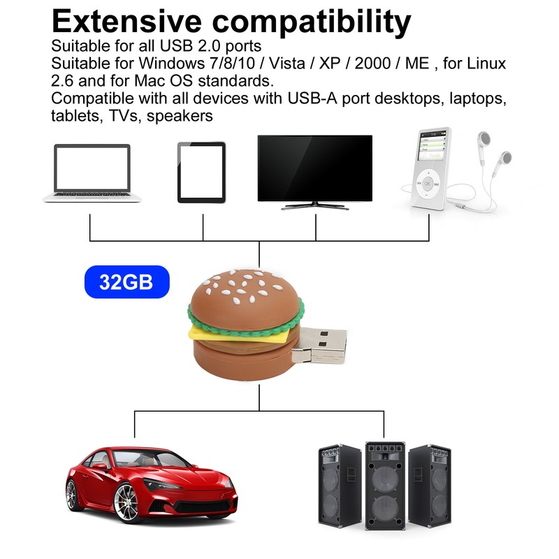 1、Compared with the appearance of the traditional U disk, this U disk is creative and novel, has an unique shape. 2、Memory Stick has advanced drive, A‑level chip U disk and their performance is stable and reliable. 3、As a practical and creative gift, you can give it to your family, friends, students, teachers, neighbors, or as company benefits to colleagues, give them a big surprise. 4、The memory stick is suitable for all USB 2.0 ports, suitable for Windows 7/8/10 / Vista / XP / 2000 / ME , for Linux 2.6 and for Mac OS standards. Compatible with all devices with USB‑A port desktops, laptops, tablets, TVs, speakers. 5、This memory stick is easy to use, plug‑and‑play, and can also be hung on the key chain, which is convenient to carry and not easy to lose.