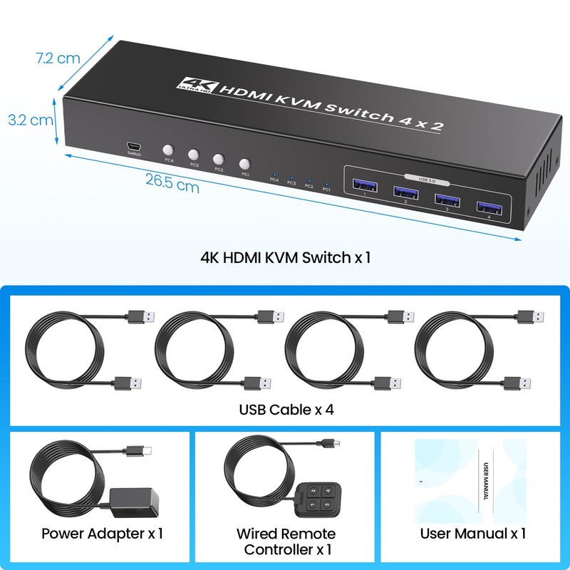 - 【HDMI KVM Switch 2 Monitors 4 Computers】Experience exceptional video quality and effortless control with our 4K HDMI KVM Switch. Designed to streamline your workflow and enhance your productivity, this 4 port HDMI KVM switch allows you to control up to four computers or servers using a single set of keyboard, mouse and 2 monitors setup.