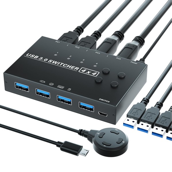 USB 3.0 Switch 4 Computers, KVM Switch 4 Computers Sharing 4 USB Devices, 3.0 Switch for Keyboard Mouse Switch,USB Switcher Compatible with Mac/Windows/Linux,Wired Remote and 4 USB 3.0 Cable Included
