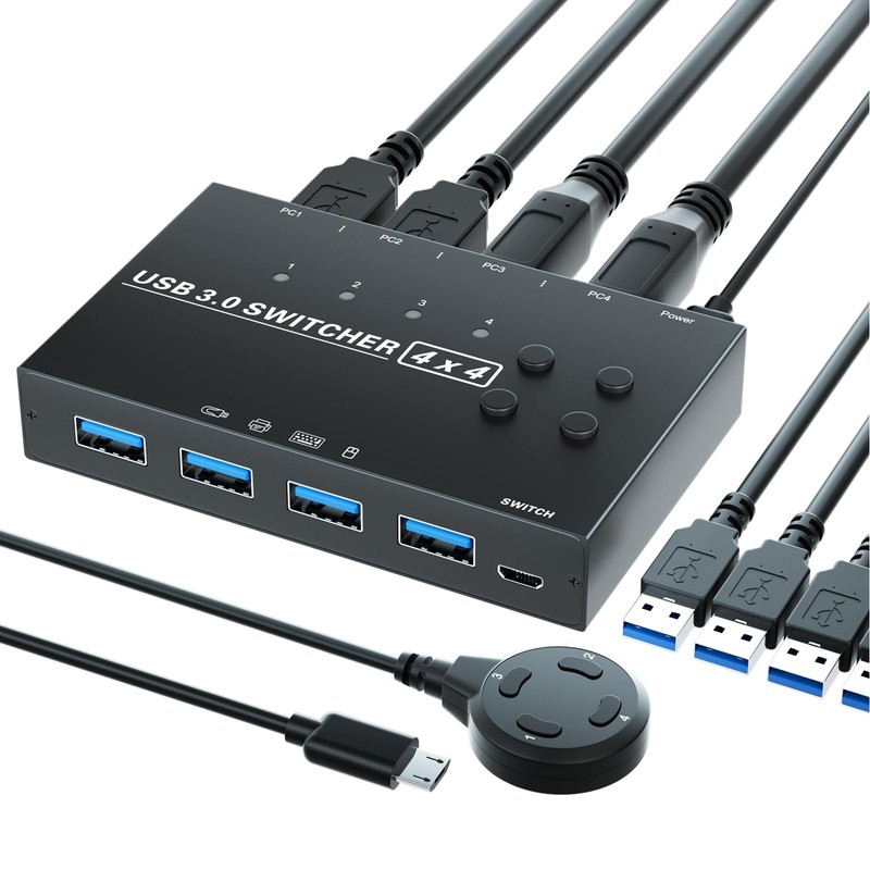 - 【4 In 4 Out USB 3.0 Switch】4in 4out USB 3.0 switch allows switching between 4 computers using a push button switch or wired remote control to share 4 USB peripherals, like keyboards, mouse, U disk, printers, scanners, etc. Switch freely between work and personal computers without pulling cables or setting up complex network sharing software.