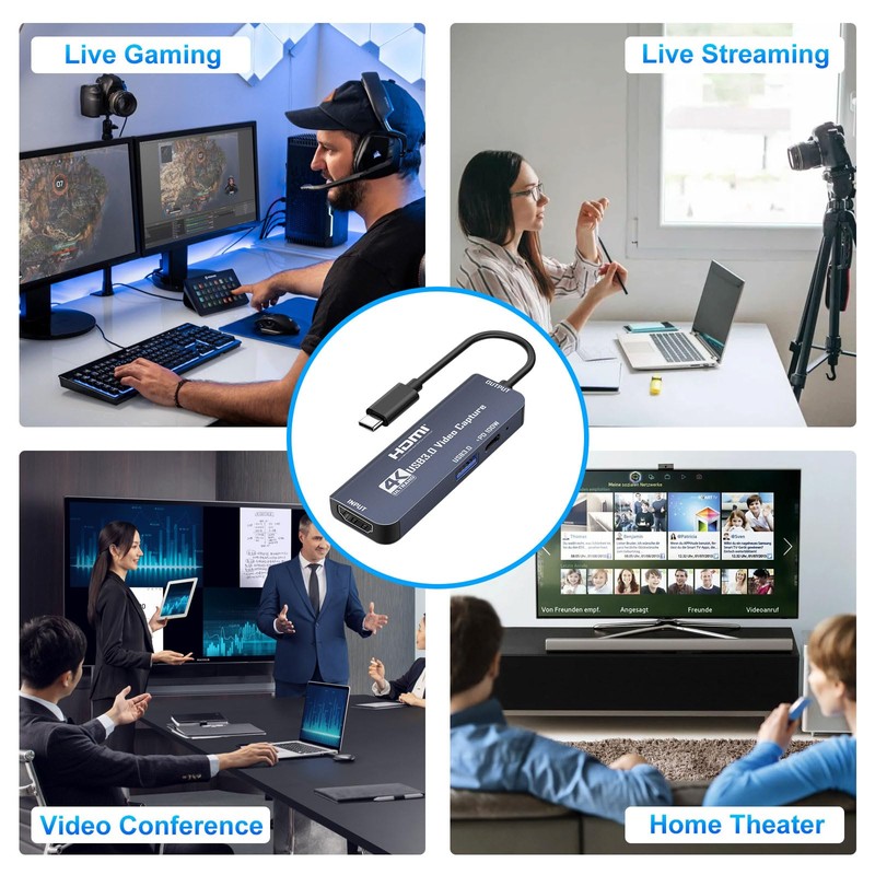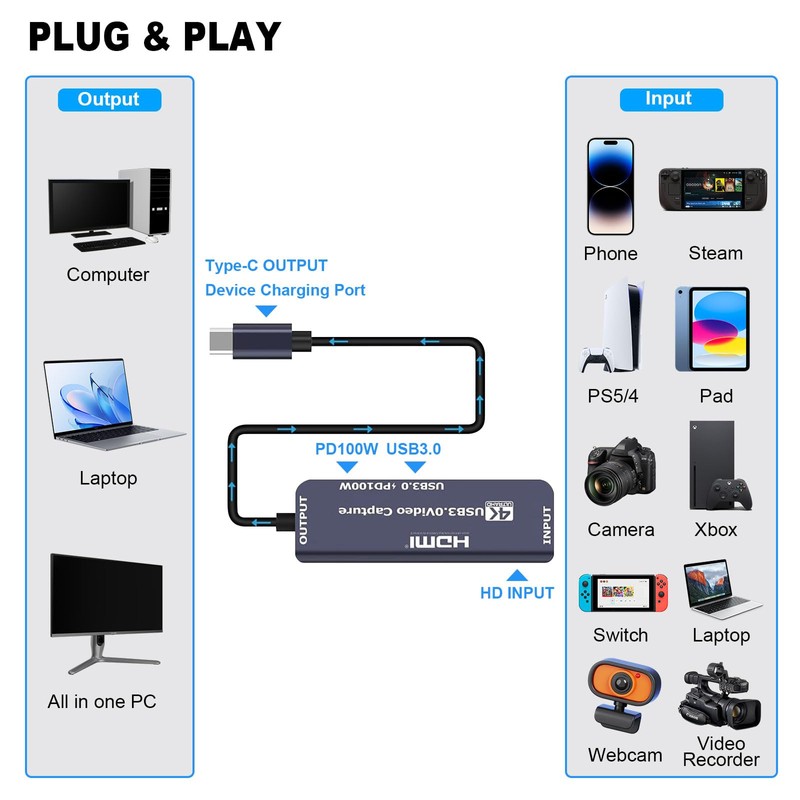 • Versatile Expansion Ports—USB C (100W PD) & USB 3.0 Ports: The hdmi capture card supports 100W PD fast charging, compatible with PD3.0, QC5.0 protocol, the product is used while charging, do not have to worry about the power of the laptop or tablet. USB 3.0 ports can support the mouse, USB disc, to meet your use needs.