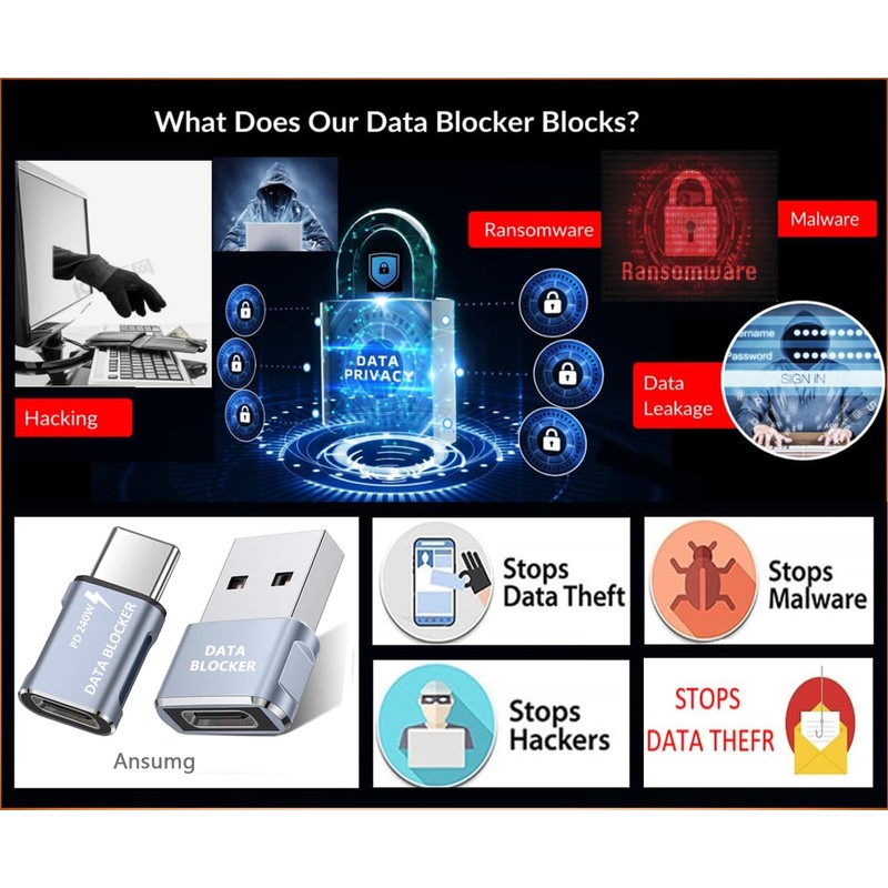 - 【The Data Guardian】Are you worried about the risk of mobile phone data leakage or uploading viruses when you use a charging station to recharge? Worried about spyware or hacking attacks on your mobile device while charging? Don't worry, choosing a Ansumg data blocker is an effective measure to prevent these potential risks.