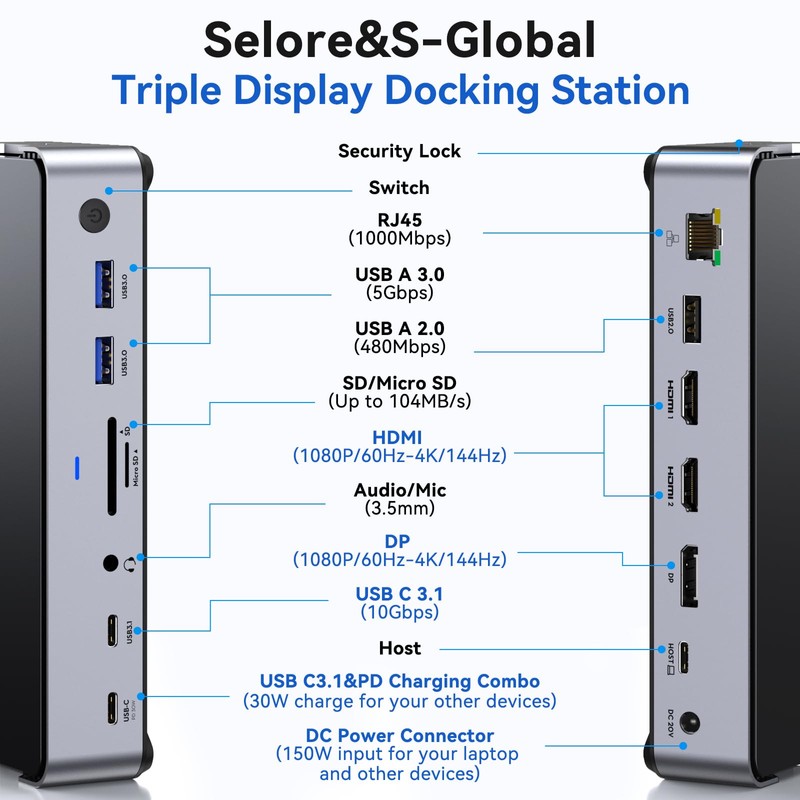 USB C Docking Station 3 Monitors Laptop Dock Dual Monitor with 2 HDMI DisplayPort 4K144Hz,USB A 2.0/3.0,USB C 3.1 10Gbps&30W Output,Ethernet,MicroSD&SD,Audio&Mic,150W DC Power for Dell/Lenovo/HP