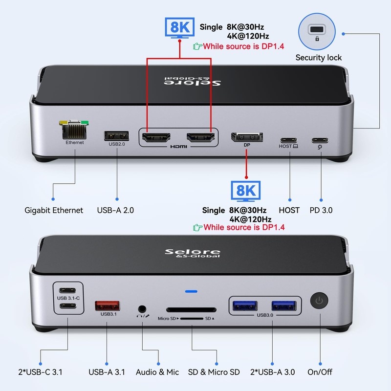 - 【Ultra HD Single 8K oder Triple 4K Display】: Die Laptop Docking Station verfügt über einen einzigen Displayport und zwei HDMI Videoausgangsports, der Monitorausgang kann ein einzelnes 8K oder dreifaches 4K Display anzeigen. Das USB C Dock erweitert die Auflösung eines einzelnen Monitors bis zu 8K@30Hz oder 4K@120Hz Erweitern Sie die Auflösung von zwei oder drei Monitoren bis zu 4K(Der Laptop ist DP1.4). Wenn die Signalquelle DP1.4 ist, ist die Bildschirmauflösung des MacOS Systems immer 4K@60Hz.