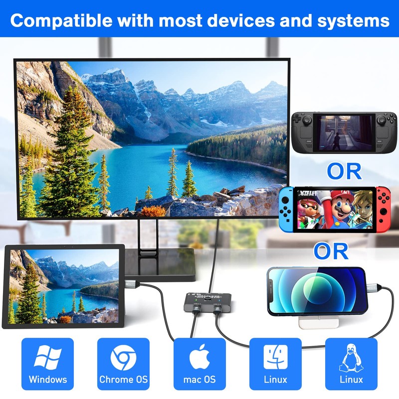 - 【8K Ultra HD Video Output】The USB C Switch support up to 8K@60Hz 4K@120Hz 1080P@165Hz via our USB C Switch/Splitter to your USB-C or HDMI Displays..The Maximum resolution and refresh rate of your output depends on your Source device, monitor,USB C Dock,and cables.