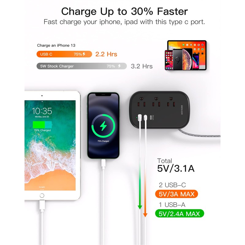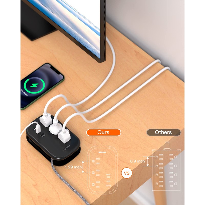 - 【6 IN 1 Power Strip with USB-C】Flat extension cord with 3 AC outlets and 3 USB ports can power up 6 devices simultaneously (the actual current is decided by the demand for the devices). Compatible with your cellphone, laptop, tablet, earphone, or cameras without a variety of converters, keeps your desktop organized, a must-have accessory for a colleague's dorm room, home, office, bedroom, kitchen.
