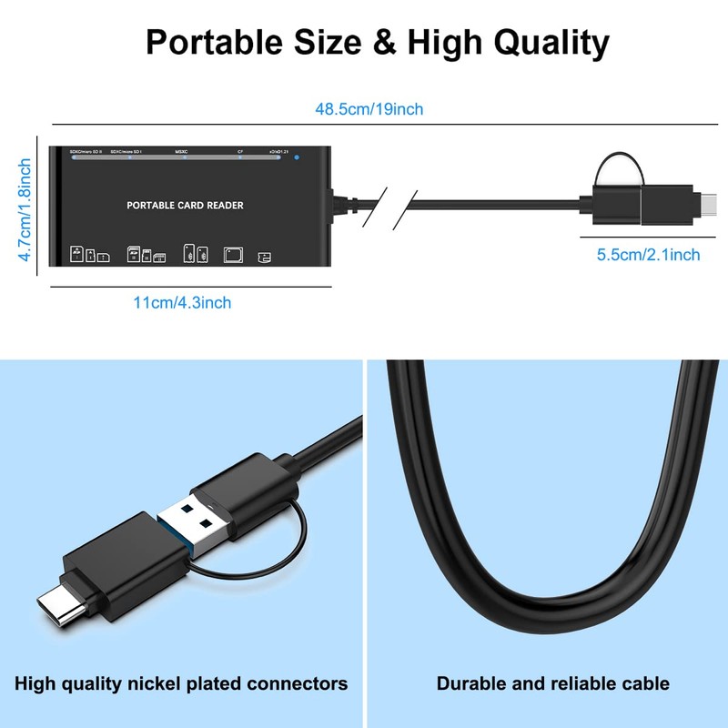 • 【Broad Card Compatibility】This USB C & USB3.0 card reader supports CF card, high-speed CF (UDMA), SD card, SDXC (up to 2 TB), SDHC, micro SD, micro SDXC, micro SDHC, TF, MS, XD memory cards,etc.