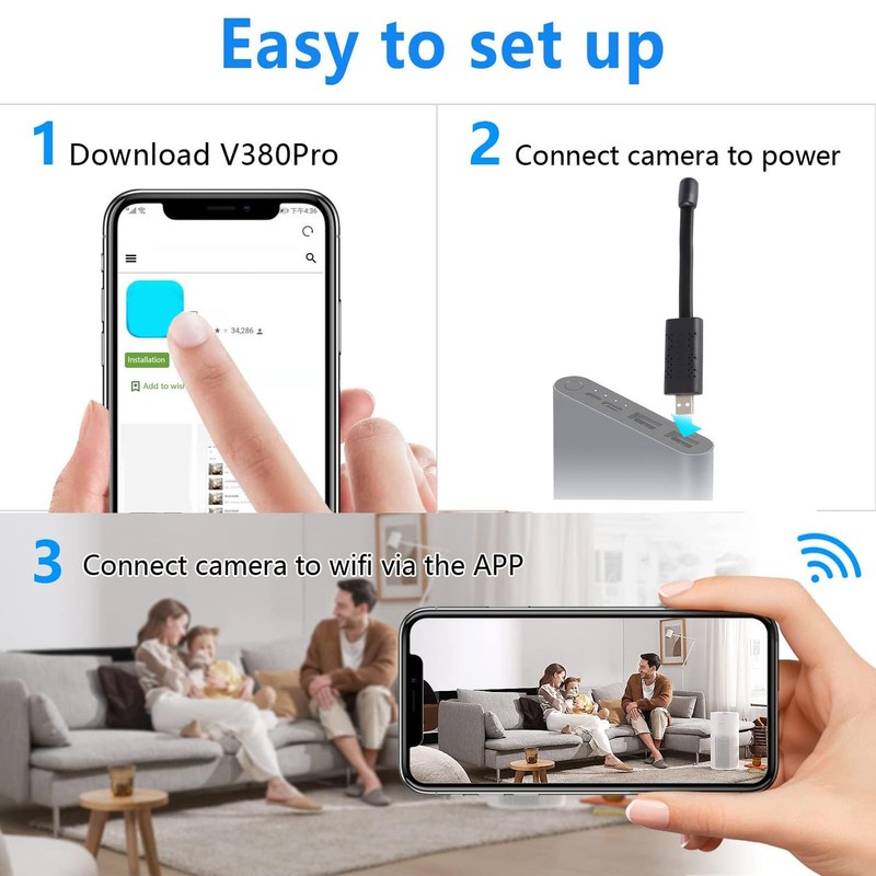 1、1920X1080P HD VIDEO: Mini USB WiFi camera has a built in 14mm / 0.55in ultra compact camera lens, a metal hose that makes it easy to adjust the shooting angle and place the camera in the right position, and an image sensor that captures 1920x1080P HD video with accurate color reproduction. 2、REMOTE ACCESS: Compatible with for Android, for IOS and for Windows PC. With a WiFi (2.4GHz or 4G) connection, you can watch live images anytime, anywhere with the app. Supports live streaming and recording without WiFi connection. The PC version of the app supports multi camera simultaneous live monitoring. 3、MOTION DETECTION: USB Mini WiFi wireless camera in motion detection mode, when any moving object is detected in the surveillance area, the camera starts recording and sends an alarm message. If you need more accurate alarm messages, you can turn on AI Human Recognition. 4、LARGE STORAGE: USB plug mini WiFi wireless camera supports local storage and cloud storage. Local storage can be up to 128 GB. Videos triggered in motion detection mode will be automatically uploaded to the cloud. This keeps your data safe and intact. 5、EASY TO USE: 1080P HD security camera is easy to use, plug the camera into a power source. Download for APP V380 Pro on your phone and add the camera to your account. Connect the camera to WiFi. you can also easily set up monitoring areas and schedules as needed.